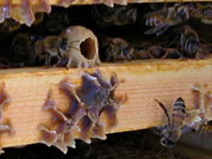 You would almost think there were no bees anymore, only beeswax, but that's not true. I visited the girls on April 10 to check on swarming tendencies, and whether we were still on target to make splits this Spring. We are. The second picture here is of an empty queencup, evidence of crowded conditions but no swarm yet: it would have to be filled and capped for a swarm to be imminent.